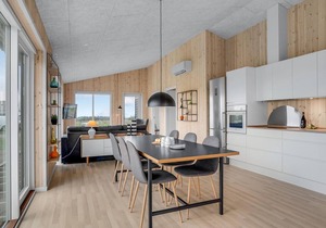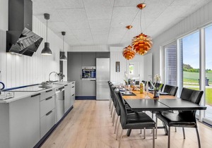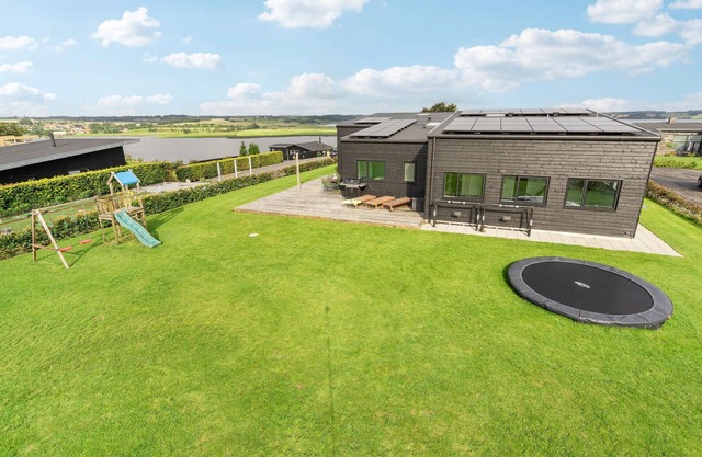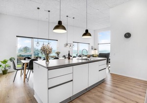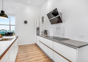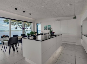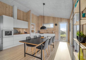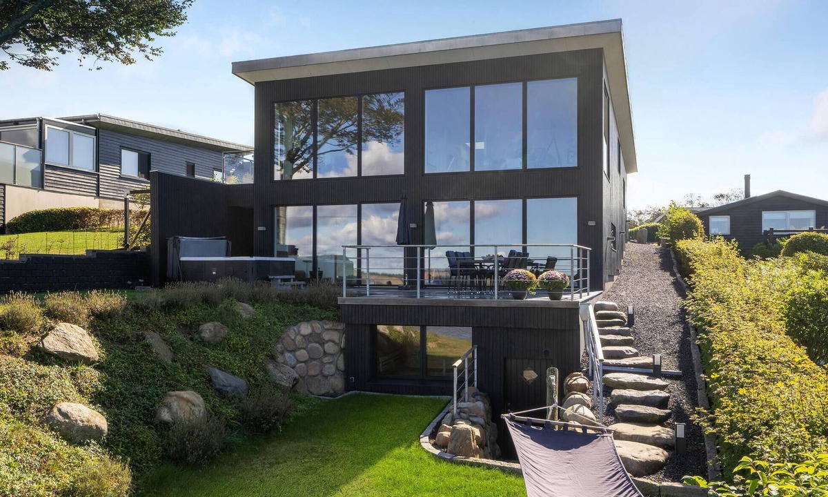 The ingenious way in which the house has been built into the terrain has made it possible to obtain a more than 180-degree view of the fjord and the landscape, which you can enjoy from the kitchen and living room on the upper floor as well as the activity room with billiard table, where table tennis tables can also be placed, and the wellness area on the lower floor, which offers, among other things, an infrared sauna.