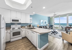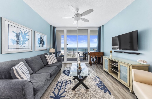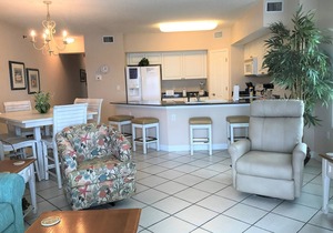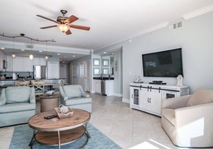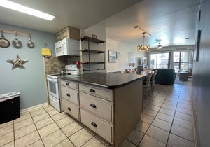 * Living room with privacy curtain serves as a great 4th bedroom and has a comfortable memory foam, queen leather sleeper/sofa, private balcony that overlooks the beach, courtyard & pool, 70" 4K flat screen smart TV that is Wi-Fi connected, books, games, toys & puzzles.