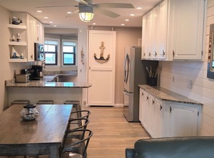 * Dining room seats 11 with 8 at the custom-made farmhouse table and bench, 3 bar stools, baby chair and plenty of table service for all.