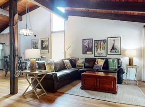 and large flat-screen TV. Upstairs, the first bedroom features a queen bed