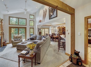 Inside, the spacious, open-concept main level invites you to relax and make lasting memories. The well-stocked kitchen flows seamlessly into the dining area and living room, where vaulted ceilings and expansive windows flood the space with natural light. Cozy up by the gas fireplace with a cup of hot cocoa and enjoy your favorite shows on the flat-screen TV. A convenient half bath is located on this level.