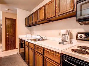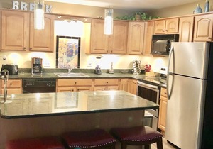 Unwind in the inviting living room area, adorned with a wood-burning fireplace and two cozy couches, ideal for curling up while enjoying a Blu-ray on the 40” flat screen TV. When it's time to rest, this spacious 1,300 square foot unit can comfortably accommodate up to eight guests, ensuring a restful and delightful stay for everyone. Each bedroom offers two Queen Beds, a 32” flat screen TV and mini fridge/coffee maker while a full-sized closet and dresser in each provide ample storage.