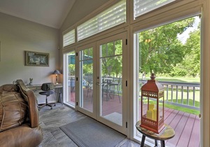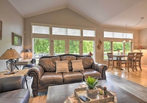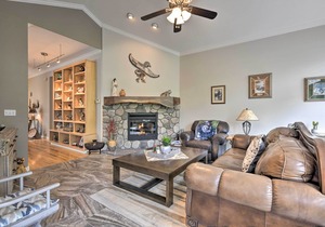 INDOOR LIVING: Hardwood & carpet flooring, ceiling fans, 2 flat-screen Smart TV's, stone-surrounded gas fireplace, natural sunlight, dining room