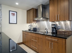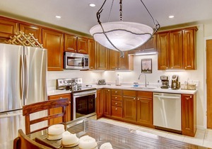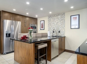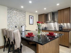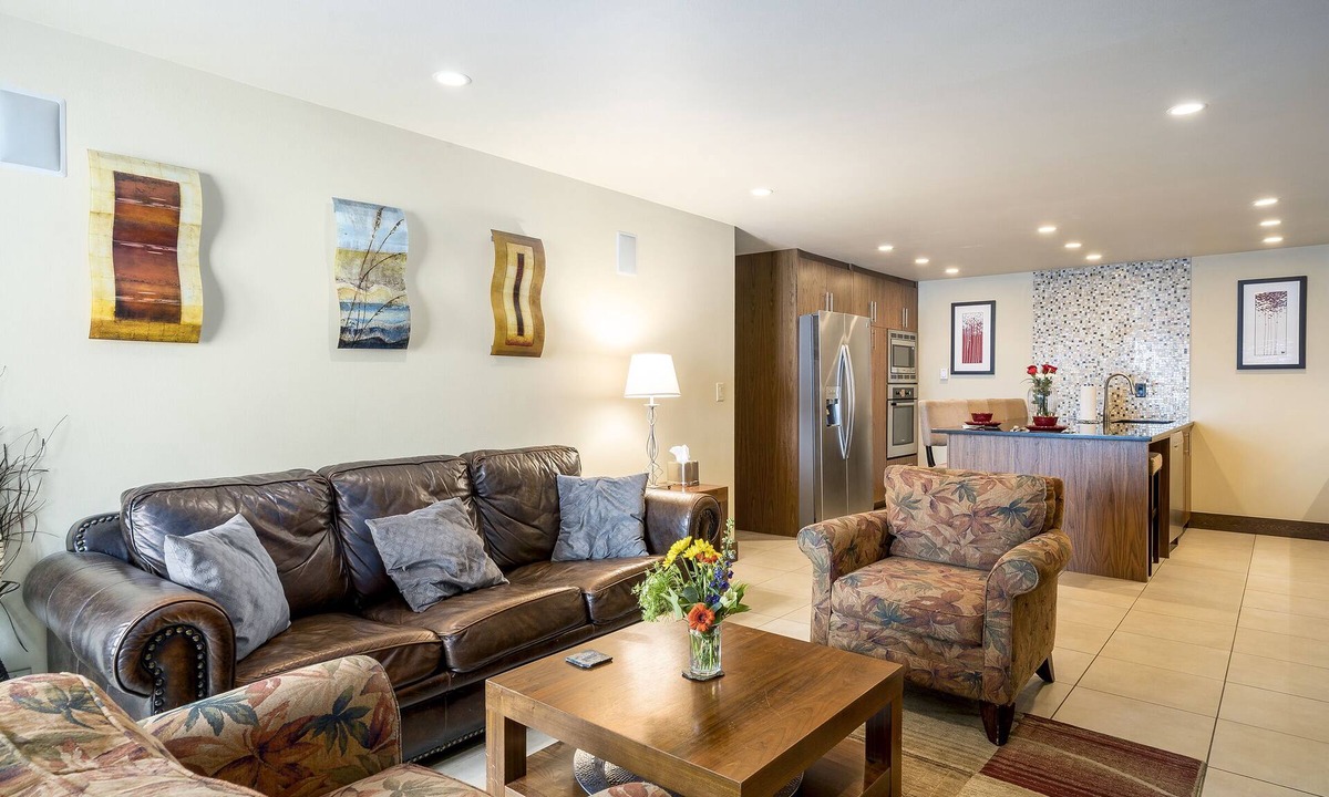 The kitchen is fully stocked with a refrigerator, microwave, stove, stove top, including dishware, silverware, pots/pans and utensils. There is a master bedroom with a King bed and ensuite bathroom, and a 2nd bedroom with 2 twin beds and another ensuite full bath. The sleeper sofa in the living area allows for extra sleeping capacity.