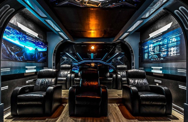 Theater room with extra-large projector screen, 8 recliner seats, and Xbox
