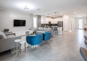 As you walk through the door, you’ll be greeted by the inviting ambiance of an open-concept living room perfect for relaxing after a day of Florida adventures.