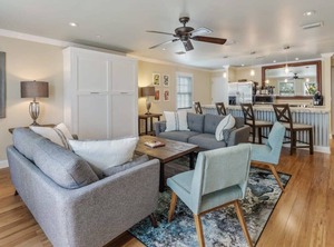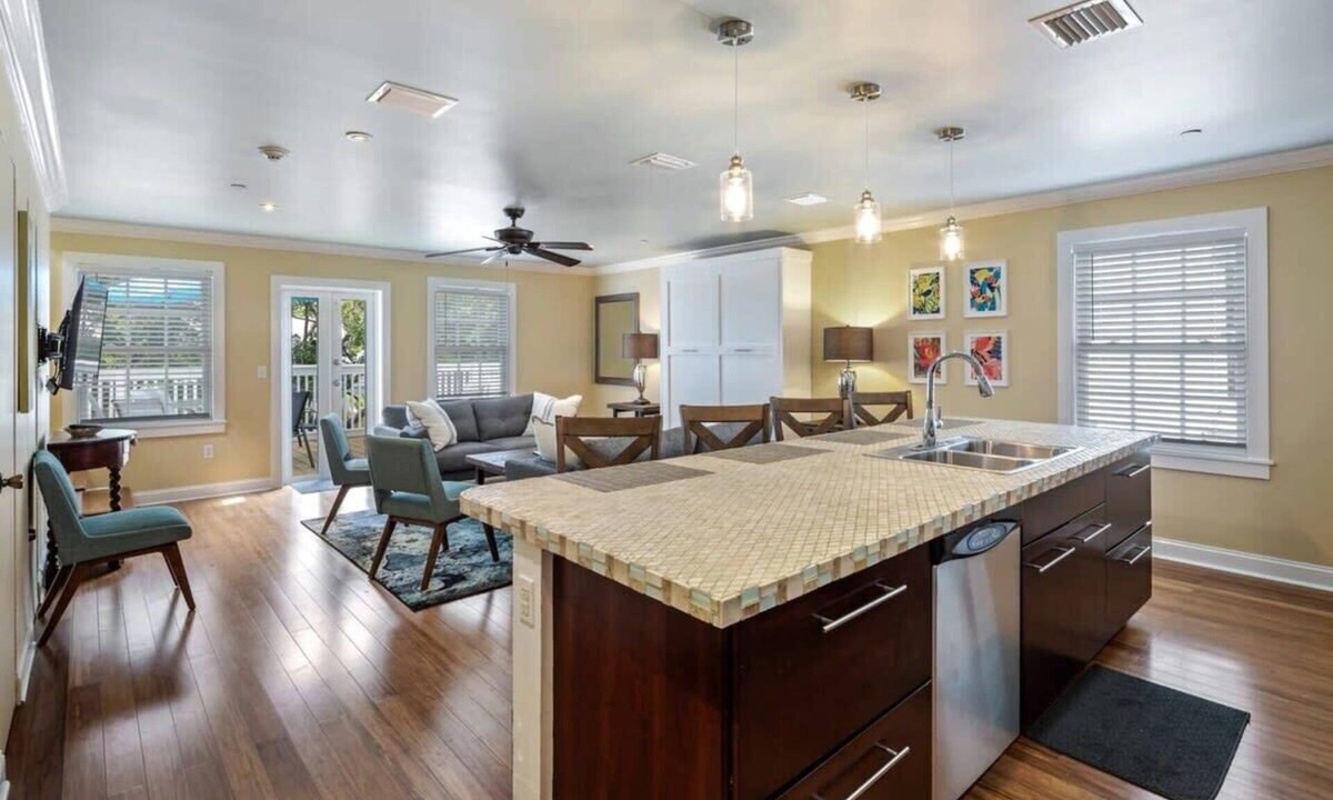 The downstairs living area offers all new furnishings and a large flatscreen Smart TV with plenty of seating for your entire group. Just off the living room and through the French doors awaits your private sundeck, the perfect place to start your day with a cup of coffee, or to end it with night cap after your late night activities on Duval St.