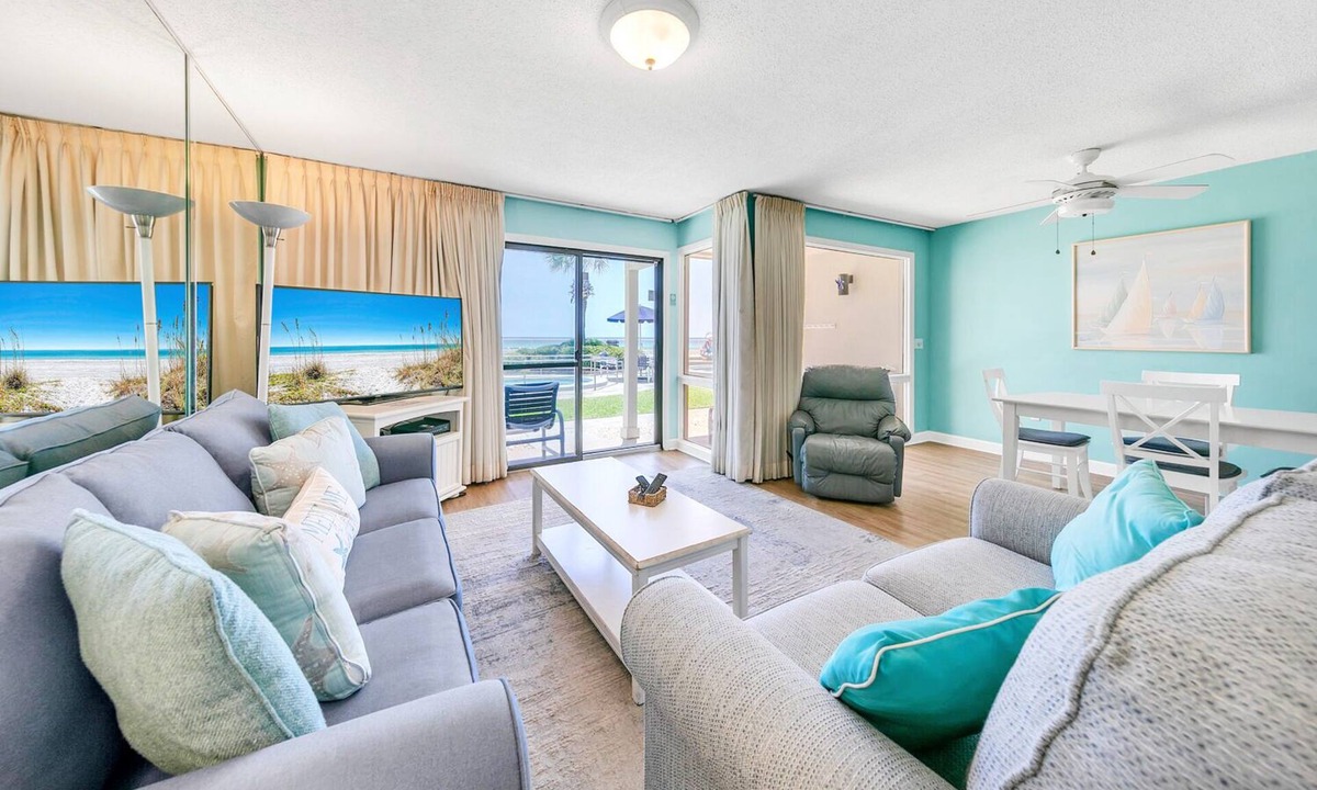 Welcome to your next vacation spot, Latitude 29 #13 .This unit is ground floor; so a short walk out the back door and you are on the sugar white beach of the Gulf of Mexico. With a king bed in the bedroom, bunks in the hall and two queen sleeper sofas, this condo comfortably sleeps up to 6 people. The fully remodeled kitchen, with stainless appliances, offers everything you need to cook breakfast, lunch, or dinner for the whole group. The living room has flat screen TV, DVD player and a second bathroom. Come visit the “Best backyard on the Beach” at Latitude 29 #13.