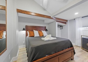 Head upstairs to Downtown Getaway Unit A’s three bedrooms. The primary ensuite bedroom, featuring its own private balcony has a plush king-size bed and large HDTV. The spa-style primary bathroom houses a glass wall walk-in shower. You’ll find cozy full-size beds and HDTVs in the second and third bedrooms. Stocked with plenty of fresh towels, the second full bathroom offers under-sink space and a walk-in shower.