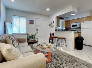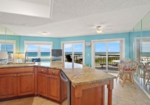 Inside, you’ll find an open-concept living space thoughtfully designed for relaxation and connection. The spacious living room features two plush couches and a cozy armchair, creating a perfect setting for gathering after a day in the sun. Enjoy movie nights on the 65” Samsung Smart TV, complete with Spectrum cable and an Amazon Firestick, or stay connected with complimentary Wi-Fi. Large windows invite natural light, enhancing the airy atmosphere throughout.