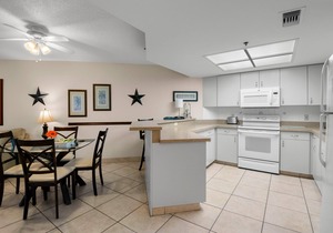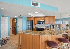 The fully equipped kitchen makes meal preparation a breeze, offering expansive granite countertops, modern appliances, and all the cookware and utensils you’ll need. Serve casual breakfasts at the breakfast bar or enjoy meals together at the dining table. For outdoor dining, the community grilling area provides a great option for preparing burgers or fresh seafood. After dinner, step out onto your private balcony to enjoy the peaceful evening breeze.