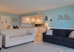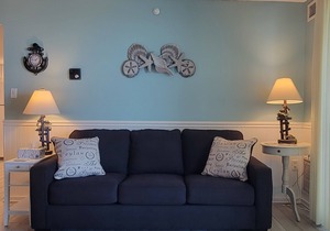 Bedroom Features: The Master bedroom suite provides a large sanctuary to get away from it all. Plenty of room for Queen Bedroom set with carpeted area, 2 full sized sofas! It has a slider that provides direct access to the balcony which also provides a great view of the ocean. The master bath features jetted tub and separate shower. There are 2 other bedrooms on the lower level one with a queen bed and access to the balcony via a sliding glass door. The other has full over full bunk with a singe bed. The bath opens to the hallway. Great for cleaning up after a day on the beach. Each bedroom has an HD TV and ceiling fans. This Condo has sold out in past summers!