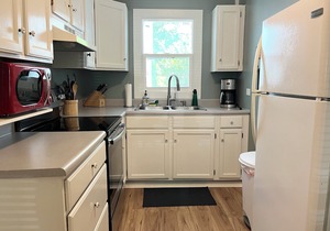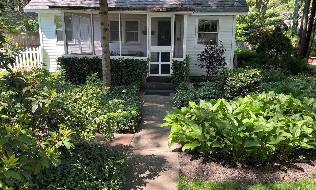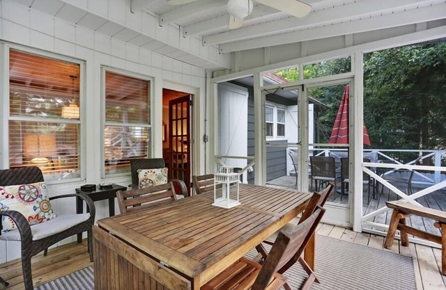 Cottage 5 is a stand alone cottage with screened porch and lofted ceilings. Already has a private, fenced in yard. Still a great arrangement for an extended family visit as you can connect through the backyard. Cottages 5 parks in the street.