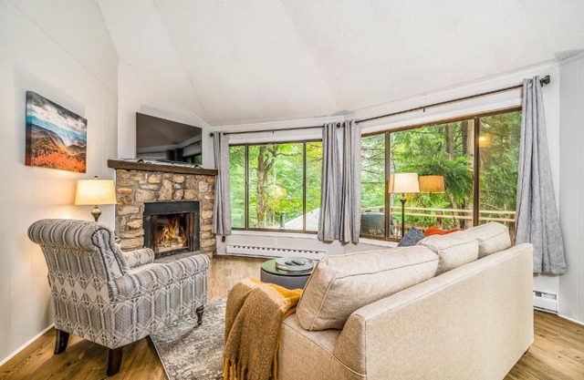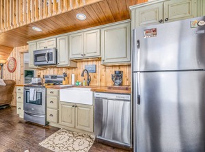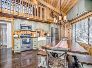 This domed house is large and spacious with a rustic wood interior and wall-to-wall windows. When the kids head upstairs, they'll find a loft with a TV and plenty of room to spread out. Downstairs, the main living space features a gas fireplace presiding over a sitting area with comfortable furniture and a large flatscreen TV, perfect for entertaining guests. The full kitchen has plenty of stainless steel appliances and cookware to help you prepare your favorite family meals. Outside, the deck is the perfect place to grill and enjoy an al fresco meal, while the firepit makes for a great place to do a little stargazing with some toasted marshmallows.