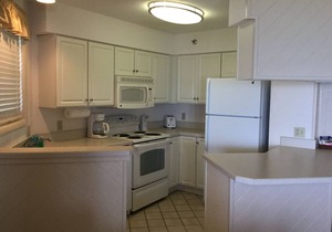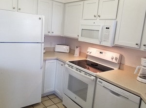 2 bedroom unit sleeps 6 - king in master bedroom, 2 twins in bedroom #2, and pullout queen sleeper sofa. All linens are provided and beds are made up for your arrival. Master has a jetted whirlpool tub/shower combination, and a 2nd hall bathroom has a shower with a seat. All towels are provided, including beach/pool towels. Kitchen has starter dish washing supplies. There is a midweek towel exchange and the washers and dryers are complimentary. Great family resort, super clean and well maintained. Office is on site and the Front Desk is all locals and is open daily.