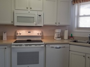 Fully equipped kitchen has 2 dining tables, plus an additional counter with stools which is laptop friendly - a great work area (if you must). And the round table is nice for cards, games or puzzles. Unit has 2 decks with table and chairs. Or eat at the picnic tables located near the charcoal and gas grills. Can walk to b/l/d restaurants and nightlife music, and even to get pizza or home made ice cream!