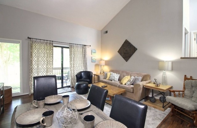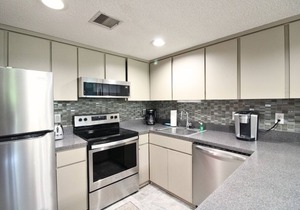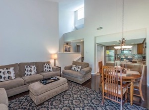 You will enjoy the beautifulscenic views of Bald MountainGolf Course fromthis NEWLY RENOVATED two-bedroom, two-bath condo. The single floor plan design features new tile floors in the kitchen and both bathrooms, richly coloredlaminate flooring, and new furniture. The twobedrooms, each with twobrand new queen size beds and mattresses, haveaprivate bath in each with tub/shower combos.The living and dining area has a cathedral ceiling, sofa, armchair with ottoman, large flat screen TV, dining table with six chairs, plus two stools along a counter. The kitchen includes ALL NEW black and stainless steel cook top range, refrigerator and freezer, built-in microwave, dishwasher, toaster, andcoffee maker.There's even astack washer and dryer in a utility closet. The deck off the living area provides a beautiful and relaxing place to unwind and watch golfers. This condo is near the commonpicnic area on Bald Mountain Lake with a shortwalking distance to other amenities.