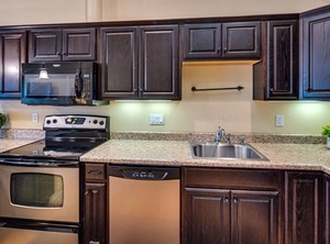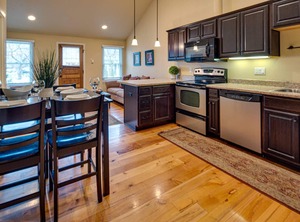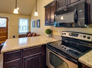 - Stainless steel appliances, including full-size refrigerator-freezer, 4 burner stove and oven, dishwasher, microwave, and toaster