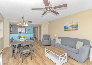 The professionally decorated living room has a flat screen HD TV, HI-speed wireless internet, a dining table with four chairs, and a queen size sleeper sofa. Linens and towels are provided for 8 guests. There are also washer/dryers in the unit. Everything you need for a great vacation.