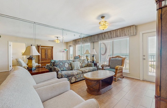 Begin your day eating breakfast on the furnished oceanfront covered balcony. Enjoy the sea breeze as you take in the breathtaking panoramic view of the Gulf of Mexico. After breakfast, take a morning stroll along the beach as the waves dance back and forth along the shoreline.