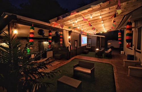 Beautiful Luxury home approximately 2.1 miles from downtown and 8 minute drive distance, spacious home is a 4 bedrooms 2 that can be converted into living rooms all have queen size beds, 1 full bathroom, with a home theater in the back yard and outdoor kitchen with a fire place great for outdoor gatherings. AT&T center is less than 3 miles away. River walk is also near by where you can walk, shop or dine.
