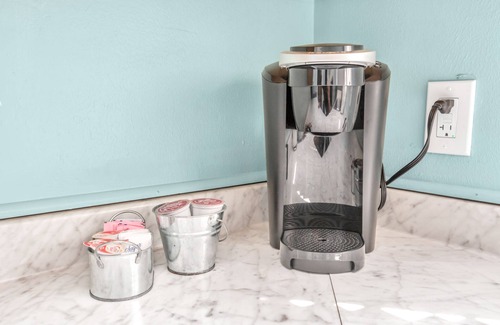 Adjacent to the living room, there's a splendid dining area and full kitchen that has all the stainless-steel appliances one could ask for including a full refrigerator, oven, microwave, dishwasher, and stove, as well as a Keurig for those mornings when you need a boost. We’ve also included some k-cups so that you don’t have to run out for them your first day. Here you’ll additionally find an outside porch and stairwell that leads you to the captivating back yard.