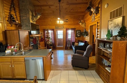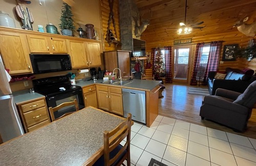 ACCOMMODATIONS: This is a 2 bedroom, 2 bath log cabin with a large Jacuzzi tub in each bathroom. We have a king, a queen, a set of bunk beds, and a sleeper sofa. All of our cabins are very clean, well stocked and furnished with almost everything you will need except food. We furnish all Towels and Sheets, Kitchen is supplied with Crock Pot, Coffee Maker and Filters, Dishes, and Pots and Pans. We furnish Coffee, Trash Bags, Paper Towels, Tissues, Toilet Paper, Soap, Laundry Detergent, and Wood for the Wood burning fireplace. We have wifi, Cable TV, 3 TVs, 3 DVD Players, DVD library, Toys, Games, Washer/Dryer, Dishwasher, and a Large Screened in deck. We also have a nice Charcoal Grill and Patio Furniture.