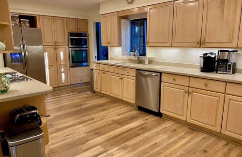 January renovations include new flooring in the kitchen, den, breakfast room, dining room, foyer, and hallway
