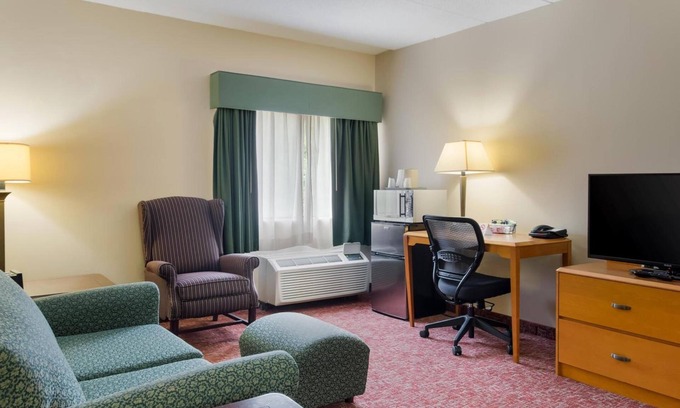 Includes two queen beds and a 42-inch flat-screen TV. Room comes with coffee maker, desk, and safe. Private bathroom features a shower and hairdryer. Enjoy free breakfast, gym, seasonal outdoor pool, and hot tub access. Free onsite parking. Pets allowed for a fee.