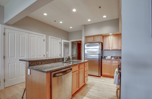 The kitchen comes fully stocked with nearly every item you’d find in your own kitchen, including a Kuerig coffee maker and complimentary coffee pods. The barstools in the kitchen provide 3 additional eating seats. The washer and dryer are conveniently located in the closet space directly behind the barstools.