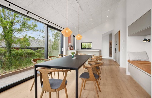 Enjoy the high ceilings and large windows in your holiday home, which let in plenty of natural light. Take a seat on the corner sofa and look out over the vast landscape through the panoramic windows. Use the fireplace to create a cosy atmosphere on cooler evenings. Gather round the long dining table and plan activities together in a peaceful setting. Prepare your meals in the beautiful kitchen with cooking island. Work together at the spacious work surface and keep in touch with your fellow travellers.