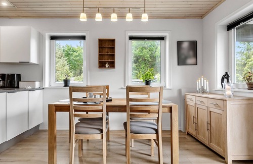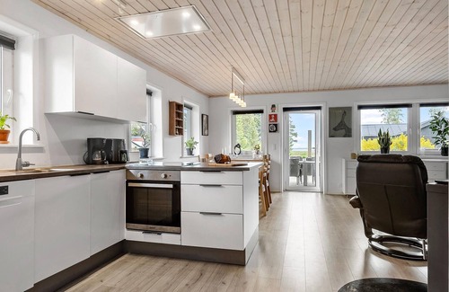 This bright and inviting holiday home welcomes you, surrounded by enchanting nature and close to beautiful beaches on the idyllic Lundø peninsula. Look forward to convivial cooking in the open-plan kitchen and harmonious meals in cosy company. Light up the wood-burning stove for cosy reading sessions or games evenings on the sofa or simply enjoy the enchanting view of the Limfjord with a spicy cup of tea.