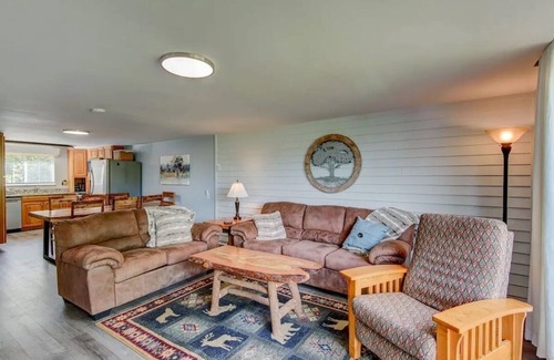 The main level has an open floor plan, which includes a comfortable, plush living room with a large-screen smart TV. There is ample table seating for dining, playing the many board games, or doing jigsaw puzzles. The kitchen is very well-stocked for making your favorite family meals. The sliding glass doors in the living room offer a picturesque view of the mountains and golf course, and open onto a private balcony where you can enjoy an outdoor meal, glass of wine, or cup off coffee, while taking in the beautiful scenery year round.