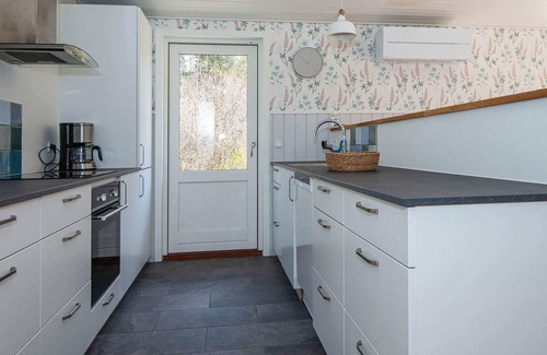 In the middle of Denmark's beautiful nature is this holiday home with plenty of space both outside and inside. The cottage exudes cosiness and idyll and on a cold evening you can warm yourself by the wood stove. The house is equipped with three good bedrooms and a large loft, which can easily accommodate 4 people. The house is equipped with 2 bathrooms and a large kitchen in direct connection with the living room, so you can be part of the community even if you are in the kitchen. There are several terraces by the house, so there is always the possibility of shelter and sun. The house has a swing. Not for rent to youth groups.