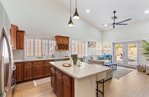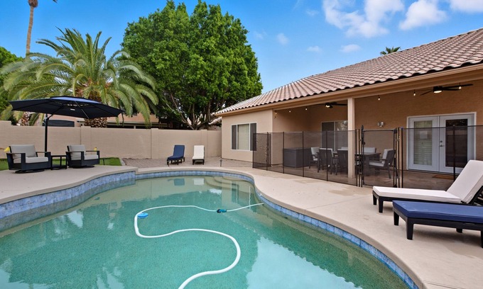 Relax with the whole family at this stylish Ahwatukee home near South Mountain, top golf courses, and shops. Enjoy a private pool, spacious yard, and single-level layout perfect for all ages. Quick freeway access gets you anywhere in Phoenix fast. Sleeps 8 comfortably — perfect for families, staycations, or desert getaways.