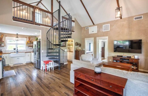 After a long day outdoors come inside and enjoy the many indoor amenities as well. When entering this unique, new home you will immediately notice the 2ft thick walls and plentiful windows. The open living area features a 65” HD TV, 30+ board games, sleeping nook and spiral staircase. The master bedroom offers a luxurious King bed with an attached bedroom with triple bunk bed and plenty of toys to entertain the smaller members of your group. A spiral staircase leads to the loft that overlooks the main living area with another queen bed, foldout floor bed and desk.