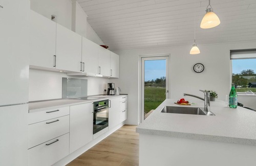 Spend your vacation not far from the beach in the exclusive vacation home. Make yourself comfortable with your loved ones in the bright rooms of the house. The tasteful, modern furnishings and subtle colors create a peaceful atmosphere where you can relax fantastically. The large panoramic windows ensure that you can optimally enjoy the great view of the surrounding landscape. The comfortable sofa corner invites you to long evenings in the living area after active days. Chat until late at the cozy crackling of the flames in the fireplace. Step out onto the terrace first thing in the morning, let your gaze wander over the meadows as you enjoy your first coffee and enjoy the first rays of sunshine as the birds chirp.