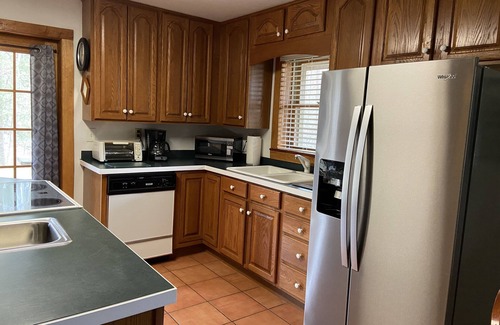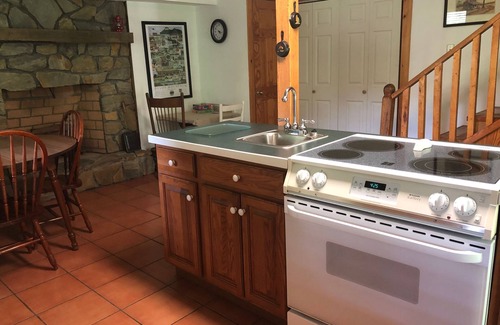The rustic cabin offers all modern amenities: WiFi throughout, a full size kitchen with basic cooking and eating utensils, oven/four burner stove top, refrigerator/freezer, microwave, toaster oven, and 12 cup drip coffee maker. The kitchen table seats four, and the counter height bar seats an additional four people. A beautiful rock fireplace with gas logs is also located in the kitchen.