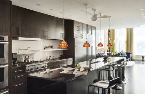 Seamless entertaining. The living/entertaining space is a dream, distinguished by 22' cathedral ceilings, floor-to-ceiling walls of restored and repointed exposed brick (east) and Wenge wood paneling (west), and a Cantilever balcony with a built-in projector for showcasing art. The awe-inspiring open chef's kitchen off the living area is adorned with floor-to-ceiling custom-built Wenge cabinets, Italian granite counters, 20' island, Thermador double ovens and separate cook top with grill, Sub-Zero main refrigerator plus 2 extra fridges in the island, Bosch dishwasher and separate Fisher Paykel double-drawer dishwasher, built-in temperature/humidity-controlled wine cooler. Off the elegant dining area with the original restored 19th Century backlit Star of David sits a rear dining terrace beyond a wall of glass and steel windows and doors.