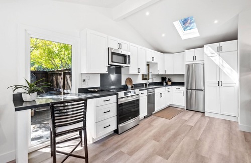 Skylights, 7’ tall windows, and large sliding glass doors fill the space with light. There is a spot at the bar to work or have meals that looks out on an old clock and 25 year old azalea. Situated around a Hollywood Regency faux bamboo and glass coffee table and vintage Heriz oriental rug are a pair of comfortable, wool flannel, Ralph Lauren arm chairs and extra seating for guests. The console table could be used for a desk or dining, and the TV is has Xfininty Cable and a Roku for streaming.