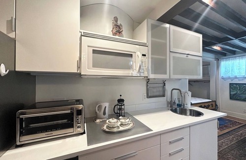 Get ready to be charmed when you stay in our beautifully appointed and exceptional artistic hideaway, just a 10-minute walk from Grauman's Chinese Theatre in the heart of Hollywood. Enjoy sleeping in a custom-made queen-size bed by French-American owner and sculptor/photographer/filmmaker Pascal Giacomini, who hand-built many of the space's delightful and unique metal and wood furnishings. Completely renovated spacious studio apartment with separate sleeping area and private entrance. Gorgeous new bathroom with marble walls and stone tile floor. Grounds and apartment filled with sculptures and art from Haiti, Papua New Guinea, Brazil, Bali, and Thailand. Our main house has been operating as a private (by appointment) art gallery for over 30 years. (The only reason we don't call this a small one bedroom is because we chose to separate the bedroom from living area with curtains instead of a door cause we like the flow better!)