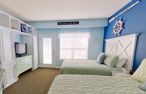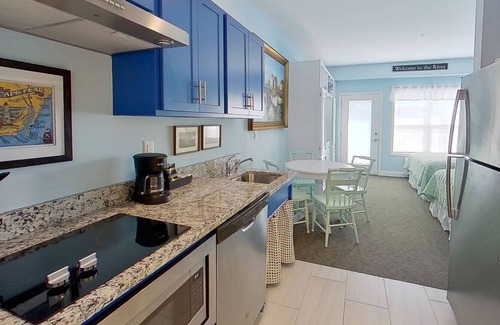 Sailors Delight is a gorgeous large suite in the newly built River Hotel of Southport NC. Simply show up and start relaxing as your beds will be made for you prior to your arrival. This unique boutique style hotel is located in Historic Southport directly on the Cape Fear River near where the river meets the Atlantic Ocean. Enjoy the incredible views of the Oak Island and Bald Head Island lighthouses from your comfortable deck, take a dip in the large pool located directly on the water front, relax on the river front beach, see beautiful sail boats passing by and take in the memorable sunsets. Also look out for the occasional sighting of container ships heading to the Port of Wilmington.