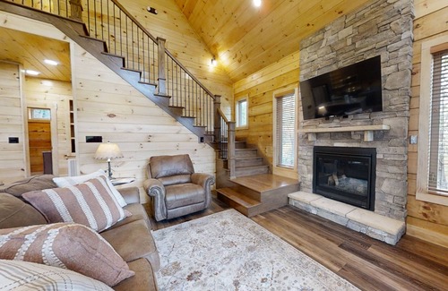 Cozy up by the warmth of the electric fireplace in the inviting living room of At Parks Edge cabin, where rustic charm meets modern comfort. Plush furnishings await, including a 3-person couch and a comfortable sofa chair, perfect for curling up with a good book or watching your favorite movie on the large flat-screen TV. The room's rustic-modern aesthetic is achieved through thoughtful touches, such as reclaimed wood accents and natural stone elements, creating a unique and inviting atmosphere. As the sun sets outside, gather around the electric fireplace and enjoy the ambiance as the flames dance and warm the space. With ample seating and a warm ambiance, the living room at At Parks Edge cabin is the perfect spot to relax and unwind with loved ones after a day of exploring the Great Smoky Mountains.