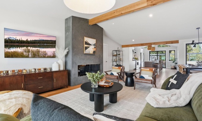 A modern, hand-troweled fireplace anchors the living space, and tasteful modern furniture from West Elm and All Modern is perfect for lounging after a day of adventure.