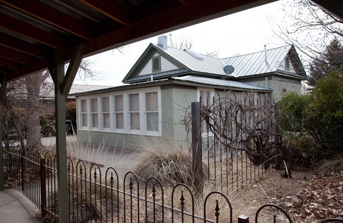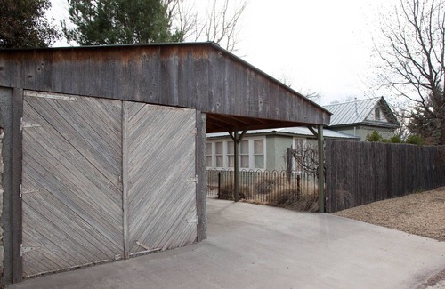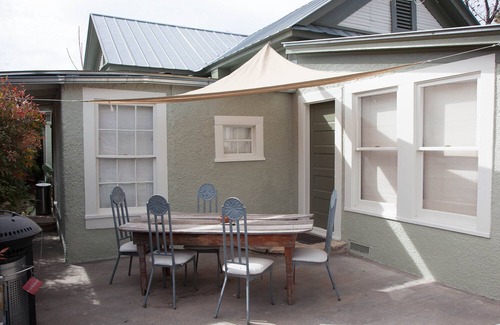 Serene 3 bed/2 bath renovated historic adobe home with original hardwood floors. Antique, vintage and modern furnishings throughout. Fenced, large, corner lot is pet friendly and offers 2 outdoor dining areas plus a nice grass lawn. Uplifting, comfortable atmosphere with high ceilings, ceiling fans in most rooms, central a/c and heat. Other features and conveniences include a cast iron sink and claw foot tub with shower, modernized kitchen, dishwasher, Bosch front load washer and dryer, full size refrigerator with ice maker, wifi and hi-def smart TV, desk with printer, and 2 indoor dining areas. Walk to almost every attraction in Marfa. Only 3 blocks from the courthouse. Exterior repainted in 2018, now green instead of blue.