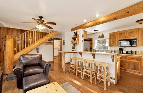 - Chef's Kitchen: Newly remodeled with custom pine cabinets, stainless steel appliances, and a dishwasher. Gather around the custom log dining table or the breakfast bar for family meals.