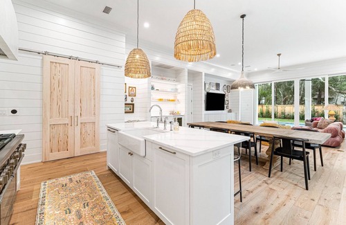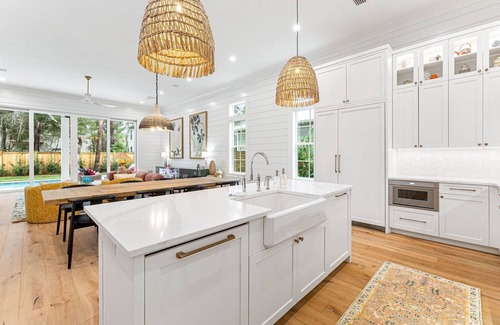 The charming front patio’s carved sofa, piled with a mix of comfy pillows and cushions, is the first nod to this 2-story home’s artistic and colorful interior. Head inside to the airy great room, where brightly hued furniture and artwork create a stunning contrast against the distressed oak wood floors and shiplap walls. The chef’s kitchen is well-equipped with Thermador appliances and an island that doubles as a 4-person breakfast bar. Mix up mimosas at the wet bar to the side and enjoy a lively brunch at the 8-seat dining table. In the living area, 2 barrel chairs and a fashionable velvet sofa invite guests to sit back and stream a movie on the 85†Smart TV. Glass sliding doors on the back wall lead to the pool deck with a chic seating area, 4-seat alfresco table, and grill set beneath overhead fans for ultimate comfort. After a day at the beach, easily rinse off sand and salt in the outdoor shower. Guests can retire for the night to the delightfully decorated primary bedroom featuring a queen bed and private bathroom.