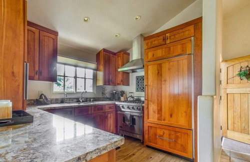 Why stay in a hotel when you can have a whole condo? The open floor plan of this downtown condo—with skylights and hickory floors—includes a cozy dining area and a living room with comfortable leather sofas, a flat screen TV and one of two gas fireplaces. And when you’re not taking advantage of the fine dining Carmel is known for, the kitchen features granite counter tops and stainless appliances.The master suite has a King bed, a fireplace, and a private bath with a large tub and a steam shower. The second guest room has a Queen bed, and the second bath, located in the hall, has a walk-in shower.Elevator access. Single garage (fits one small/medium car only) in the Carmel Realty lot on Junipero (1/2 block away). There isunmetered street parking on Junipero past 5th, and a free parking lot (no overnight) on 3rd, between Junipero and Torres. Carmel-by-the-Sea TOT License 25759 [enter desc]