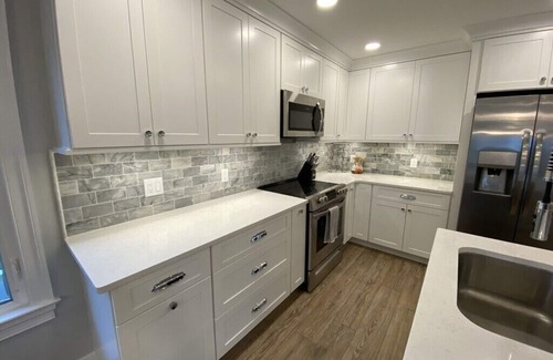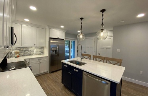 An open floor plan, relaxing color choices, and comfortable furnishings throughout provide the perfect vacation experience. The gourmet kitchen has everything you need for meal preparation (cookware, utensils, drip coffee maker, Keurig, air fryer, toaster, blender, crockpot, etc.). Basic kitchen supplies (trash bags, hand soap, dishwashing & dishwasher detergent) are included. There's plenty of seating at the large dining table and kitchen island. A full-size washer and dryer (detergent & dryer sheets included) are on the first floor, and a half bath is right off the dining area.