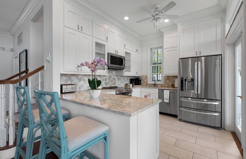 The downstairs guest room comes with a queen size bed and a private porch. There is a full bathroom just outside of this bedroom with a walk in shower. Upstairs you will find the king master bedroom with an en suite full bathroom that comes with a desirable claw tub, walk in glass shower and washer/dryer set. Adjacent to the master bedroom is an enclosed, air-conditioned Florida room with cozy seating which then leads you out to an additional outdoor, covered balcony with incredible views of the lush tropical pool area.Steps down the hall is another guest room with a queen size bed, an en suite full bathroom with a shower/tub combination and a private, covered balcony area. The colorful, teal-tiled poolside cottage comes with a queen size bed and anen suite full bath with a shower/tub combination, and it is air-conditioned. All bedrooms are equipped witha flat screen TV and ample closet space including the guest cottage.